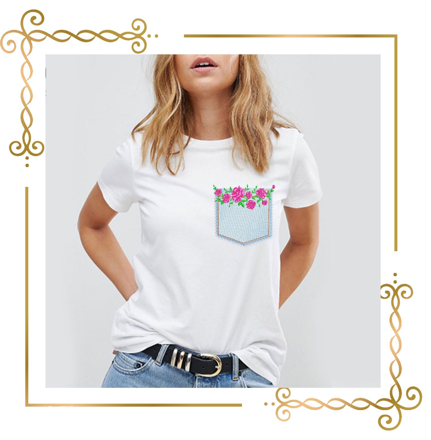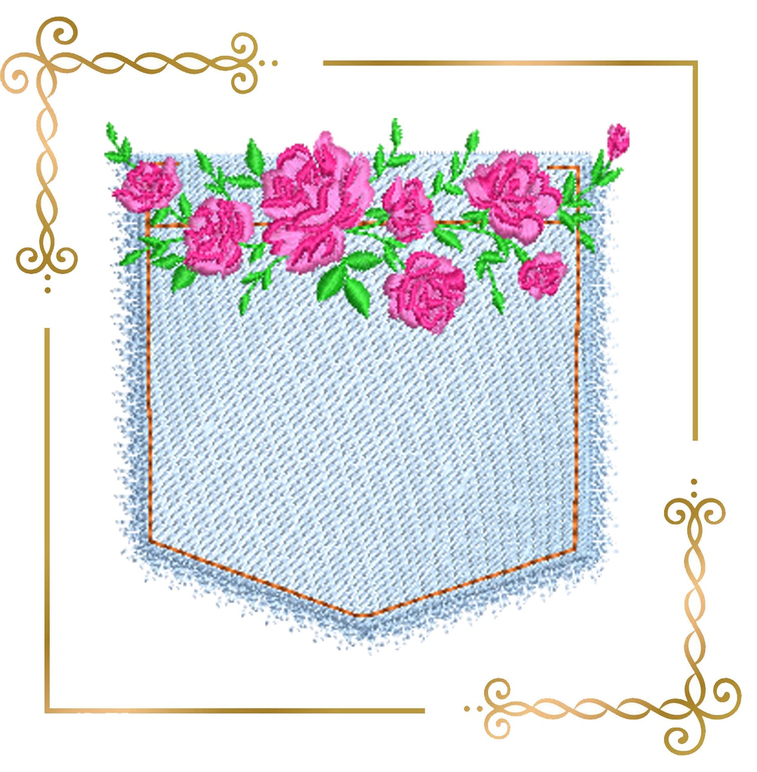 Blumen, Jeans, Rose, Tasche, Stickmuster zum direkten Download.