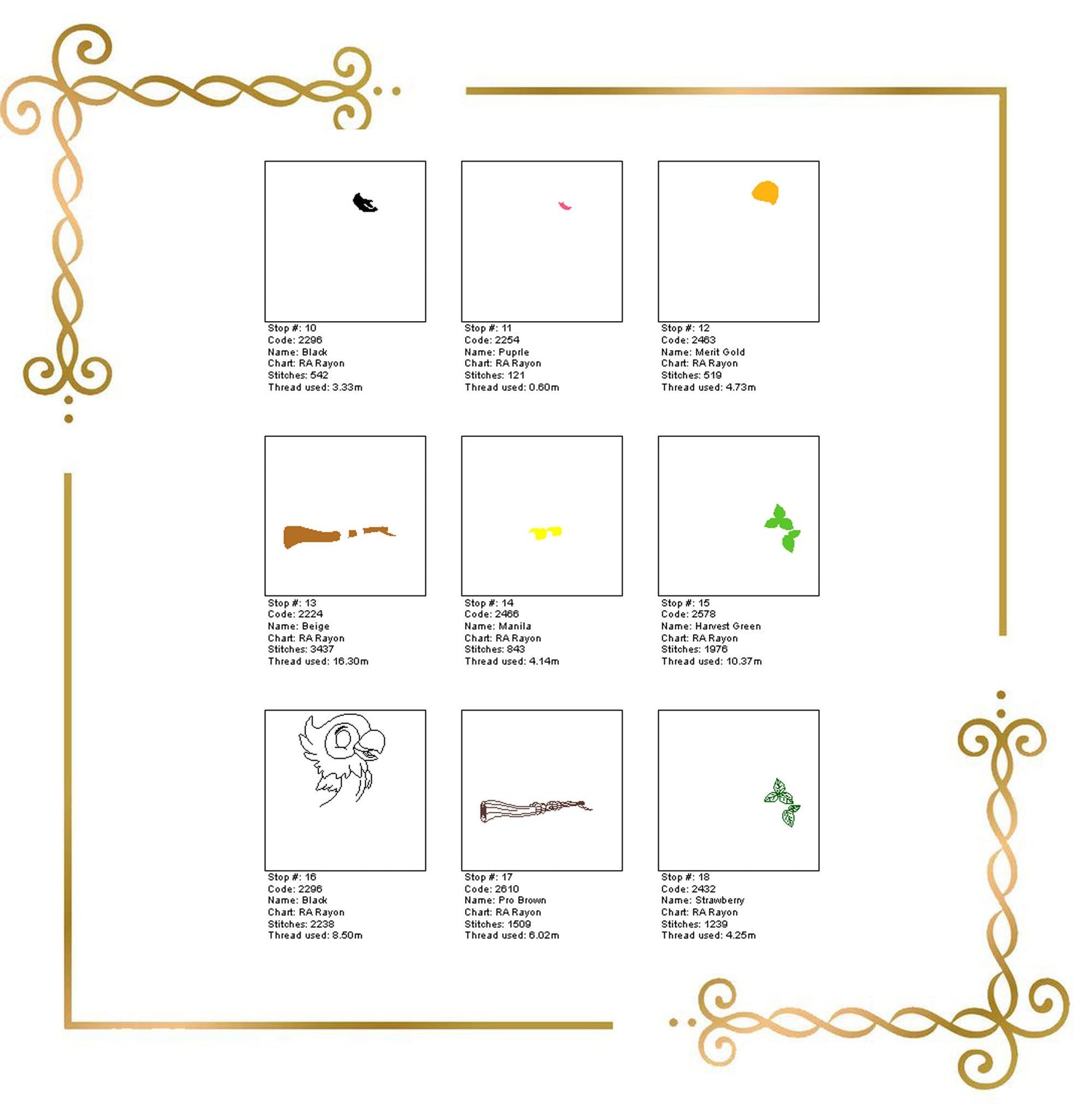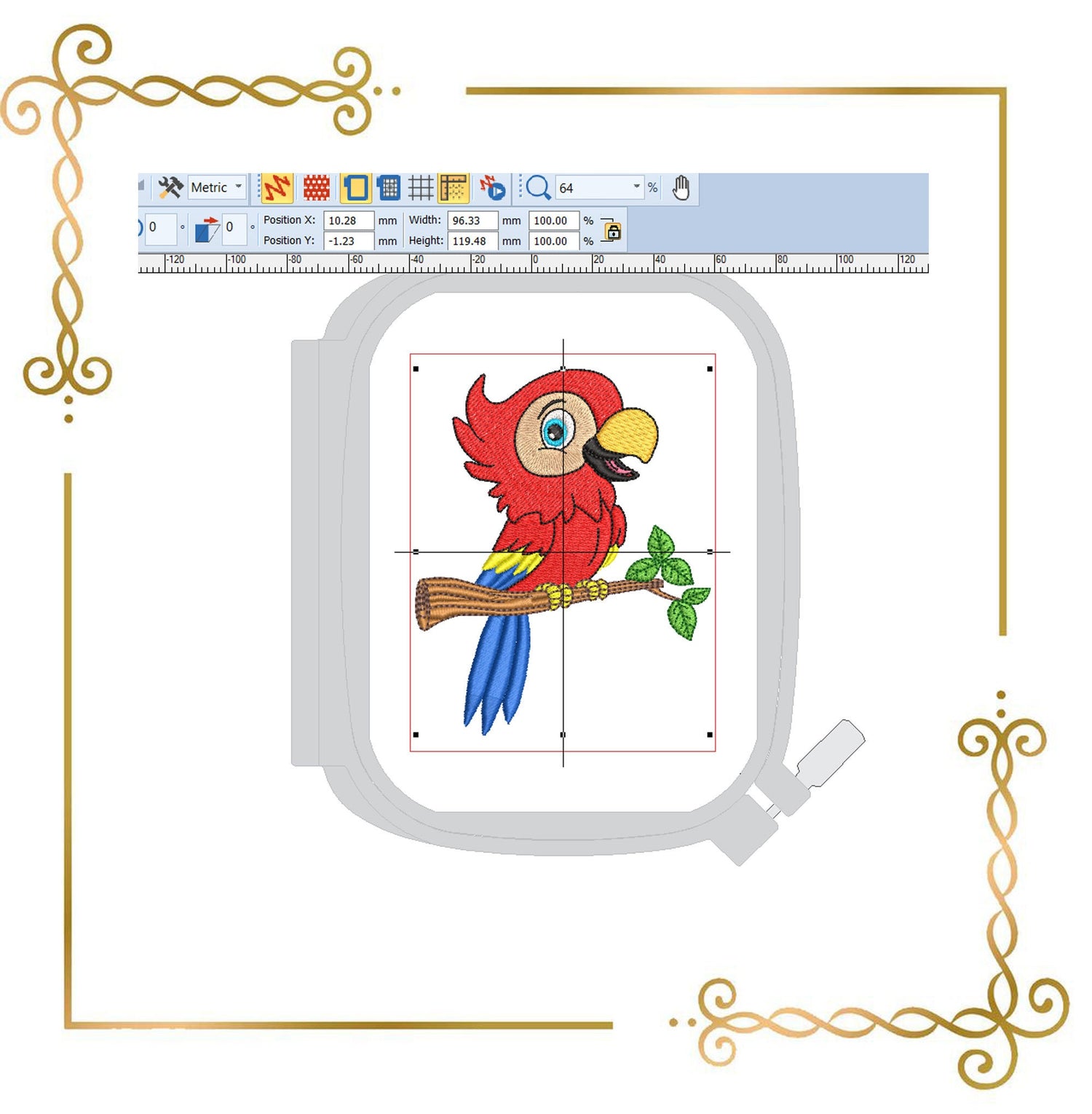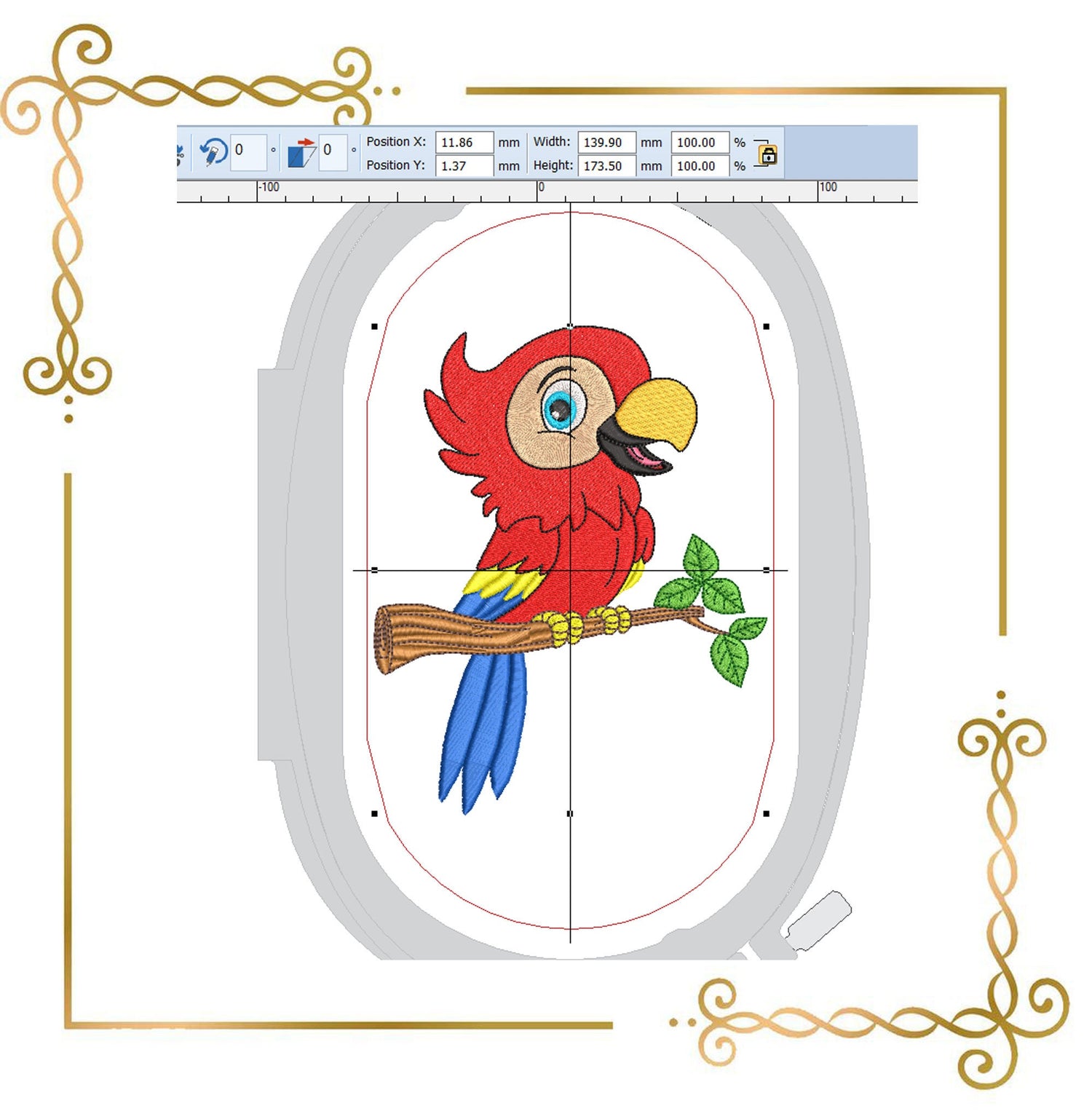 Zeichentrickfiguren Papagei auf einem Ast Stickmuster in 2 Größen zum direkten Download als Geschenk für Kinder