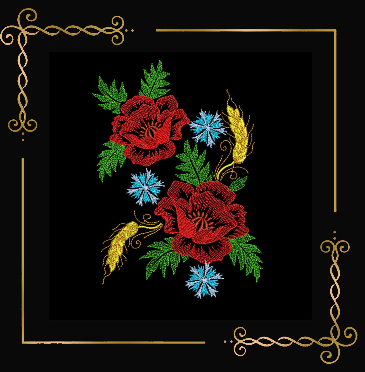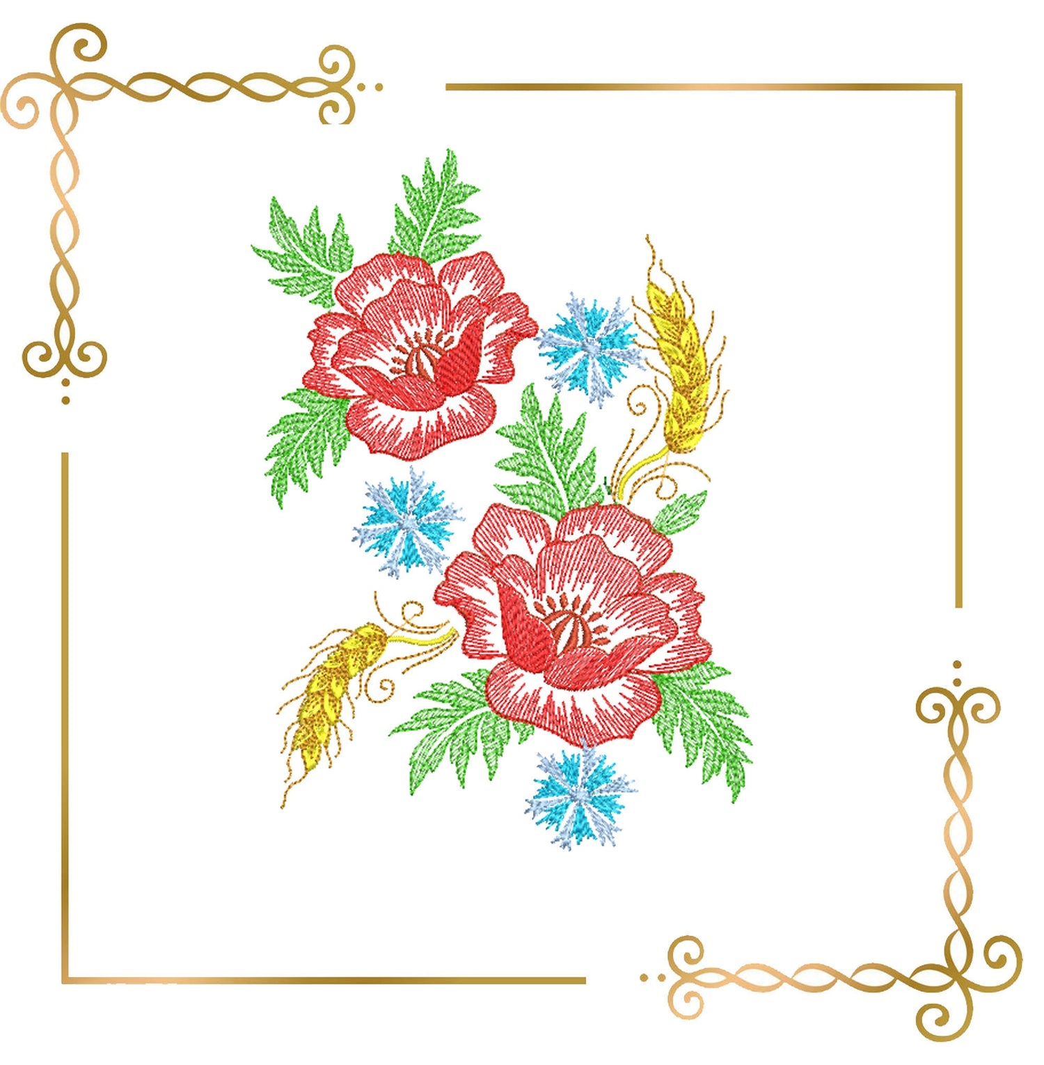 Blumen Roter Mohn, Kornblumen, Weizenährchen, Stickmuster zum direkten Download.